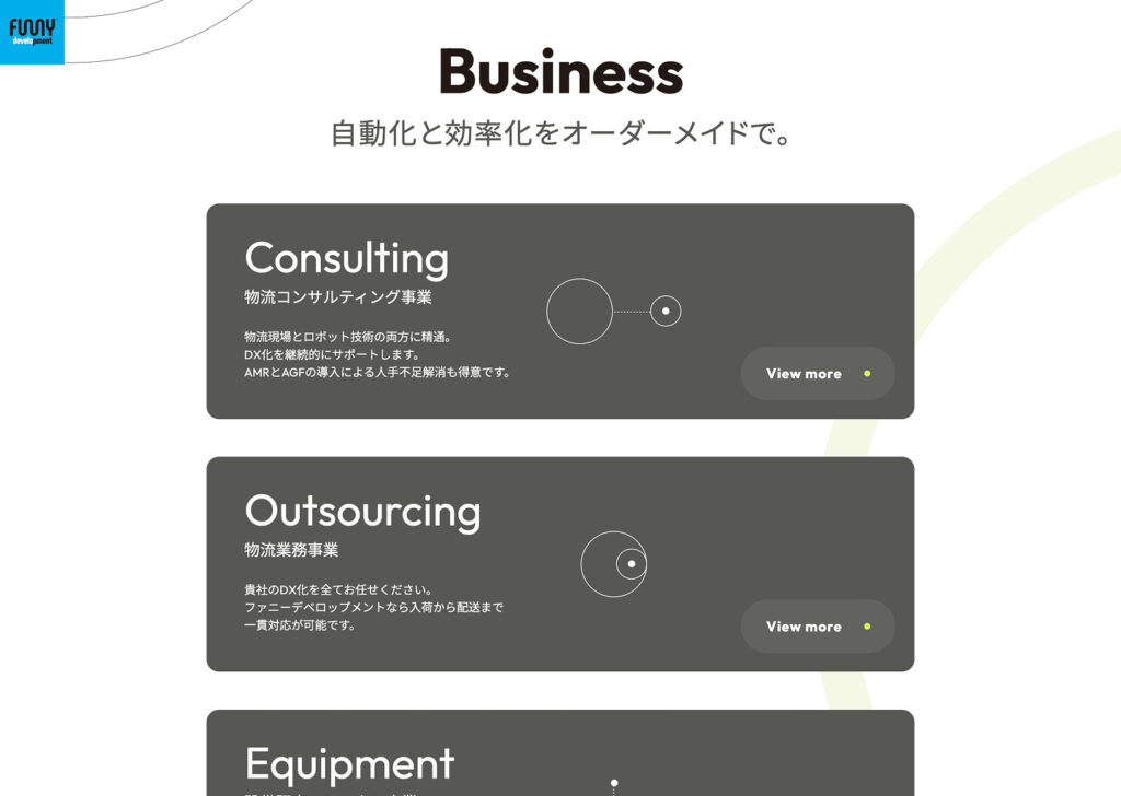 ファニーデベロップメント様は多岐にわたる事業を実行し、今後の展開も計画していらっしゃったため、ホームページ立ち上げのタイミングで一度事業内容を整理をすることになりました。事業内容をヒアリングさせていただき事業を大きく3つに分類することとしました。
