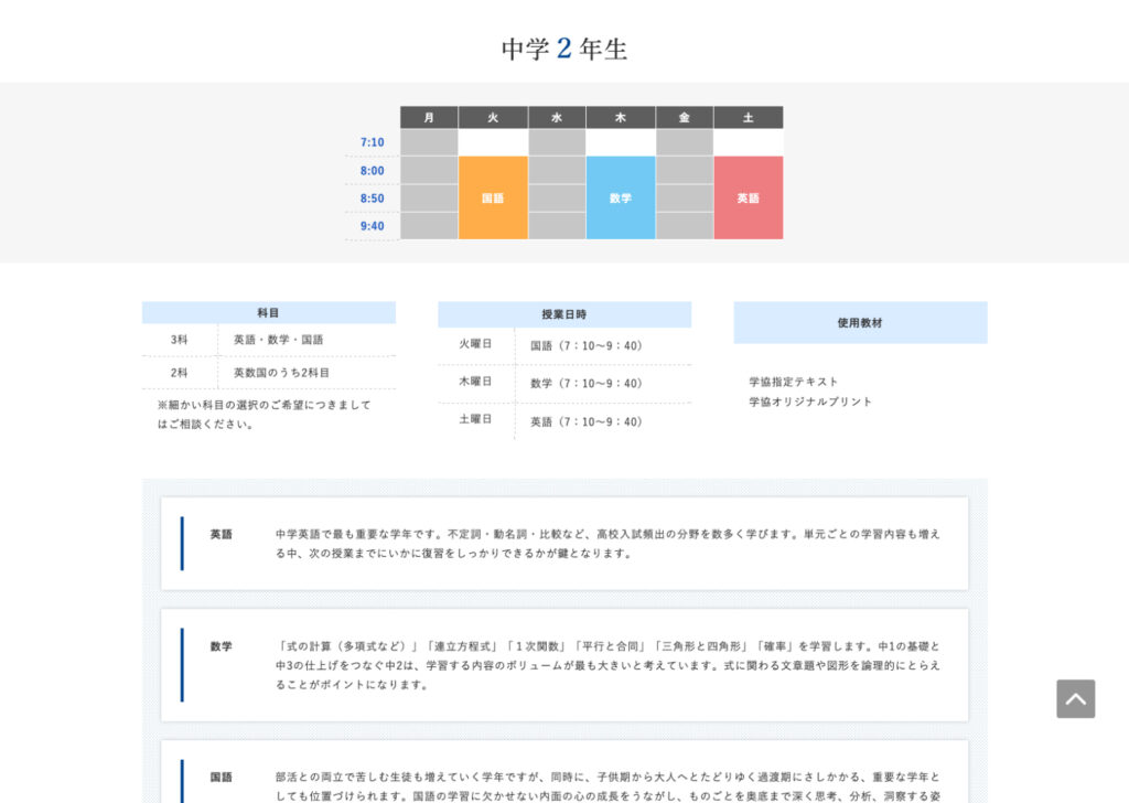 60年以上の歴史を持つ伝統ある進学塾としての誠実さと温かみを、青を基調とした配色やレイアウトのバランスで表現しました。各授業項目ごとに色分けを行い、視覚的にも情報が整理されて伝わるよう工夫しています。