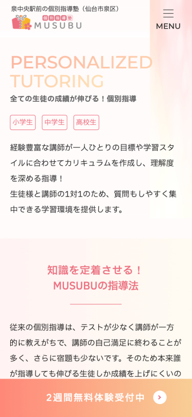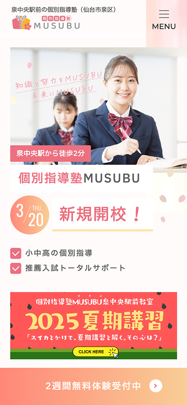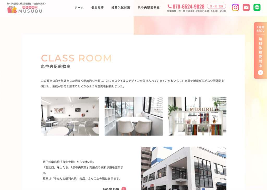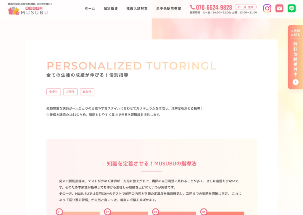 青森に本校を構えるアカデミーグループ様。これまでもホームページの運用代行でサポートさせていただいてきたご縁から、新たに仙台市内に開校される個別指導塾のホームページ作成をご依頼いただきました。