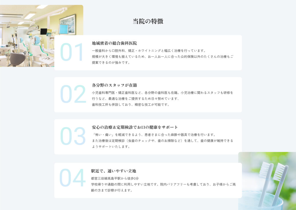 地域に根差した歯科医院としての安心感と、幅広い診療に対応できる総合歯科医院というクライアント様の強みを打ち出しました。