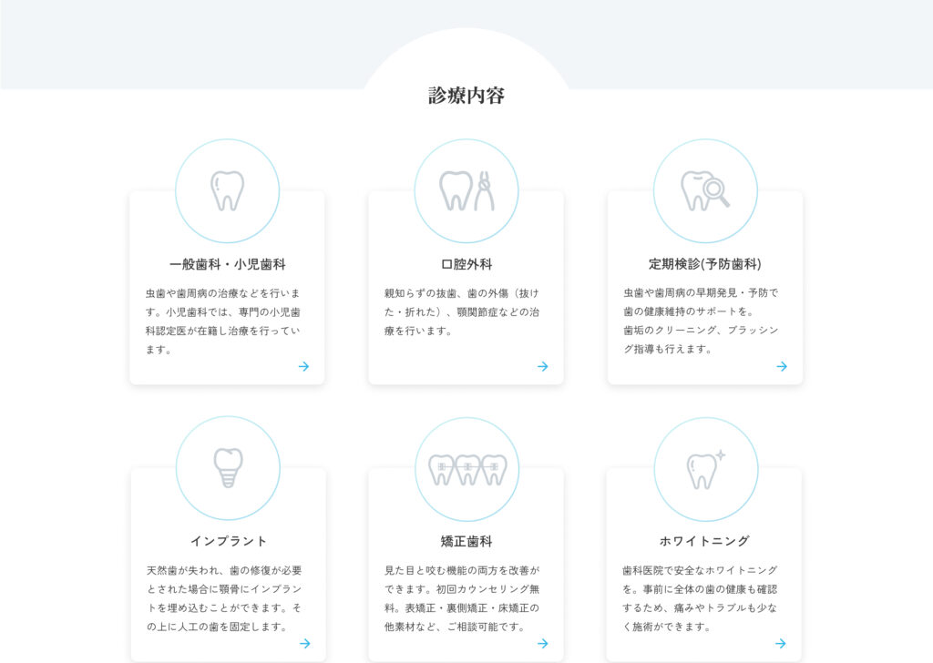 お打ち合わせで伺った「患者様にできる限りの治療を提案したい」というクライアント様の姿勢をデザインに落とし込みました。地域密着でありながら幅広い診療科目に対応できる“総合歯科医院”としての信頼感を表現するため、清潔さや堅実さを基調にしつつ、親しみやすさを感じられる曲線を取り入れています。診療内容の多さはアイコンを活用して整理し、初めての方でも直感的に理解できるよう工夫しました。