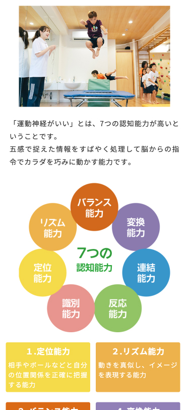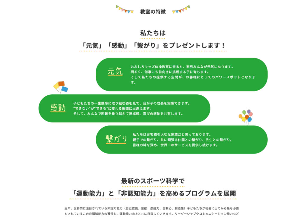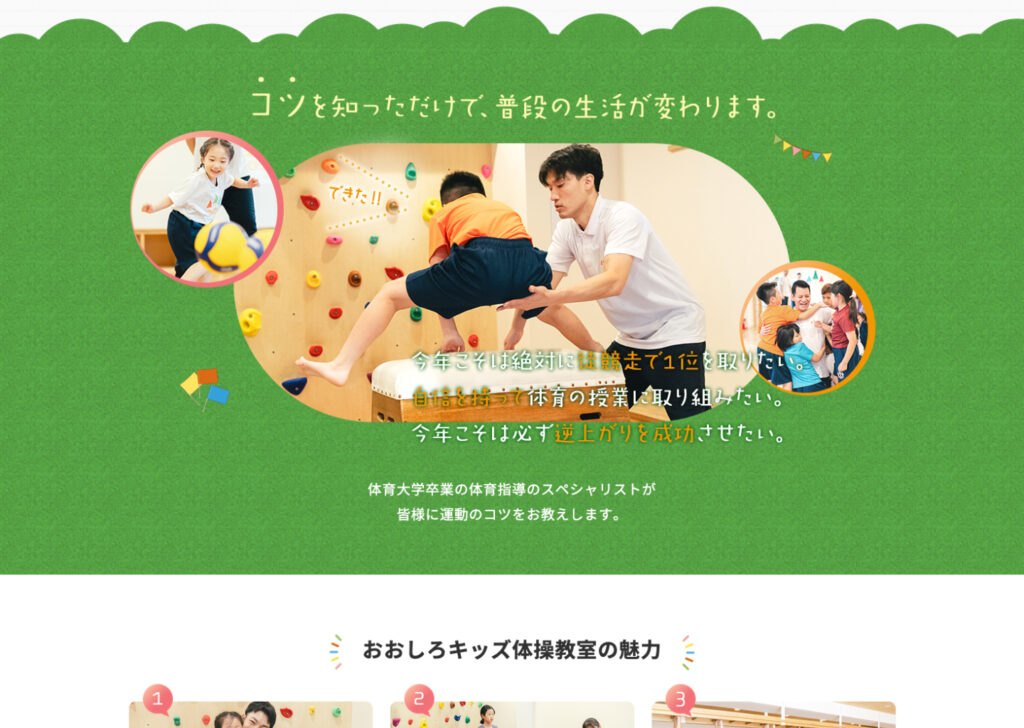 三軒茶屋の体操教室。お子さま向けの教室になりますが、ホームページをご覧いただくのは保護者さまになります。「もしも自分の息子・娘が教室に通うことになったら。」をイメージしてもらいやすくするために、写真、動画を大きく、多めに掲載しました。 また、代表者さまのお子さまに対する教育の熱意についても、わかりやすく掲載いたしました。