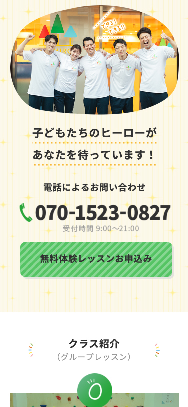子ども向けの教室ですが主なターゲットは保護者の方なので、安心感と信頼感を持っていただけるよう見やすさや構成に配慮しつつ、「楽しそう!通わせたい!」と思ってもらえるよう、明るく親しみやすい、楽しいデザインを意識しました。