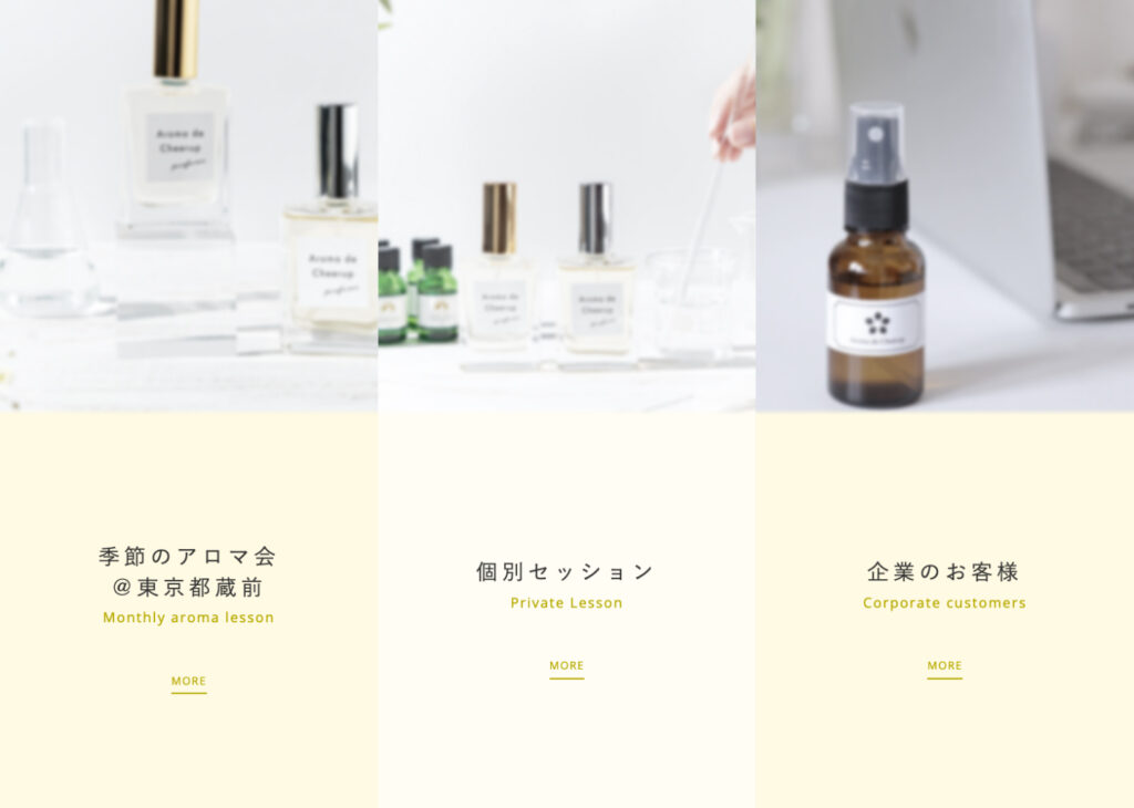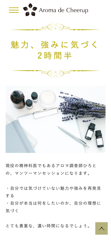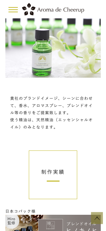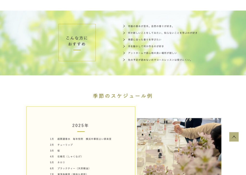 オリジナルのアロマ香水創りやアロマ体験レッスンの事業立ち上げに伴い、ホームページ制作を承りました。商品・サービスのイメージ、特徴をご利用者さまへ伝えるために、写真は大きく、デザインはやわらかな雰囲気に。