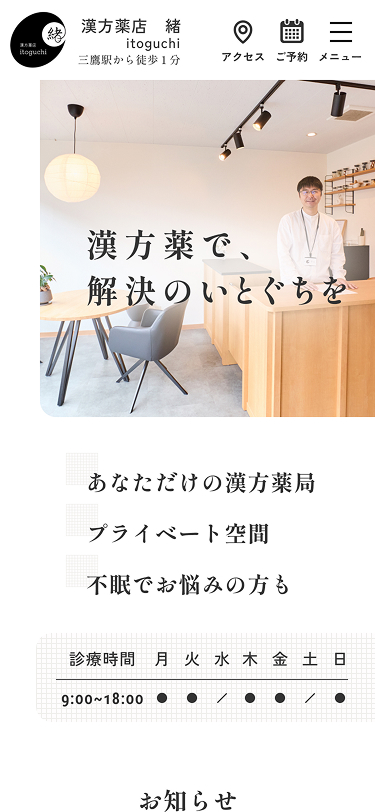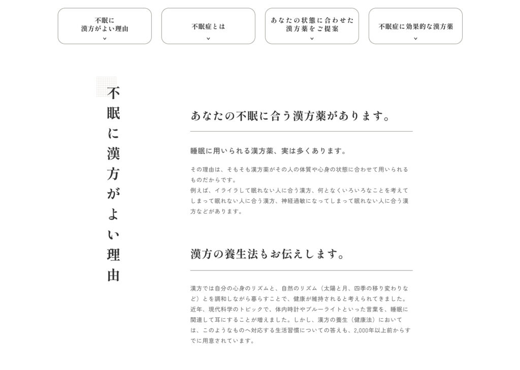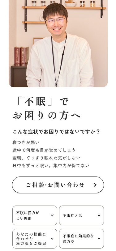 サイト制作にあたり、特にこだわったのはTOPページだけでなく、体や心のお悩みに回答するページに最初に訪れるユーザーへの導線設計です。すでに悩みやストレスを抱えている方が少しでも快適に利用できるように、安心感と使いやすさを重視してデザインしました。