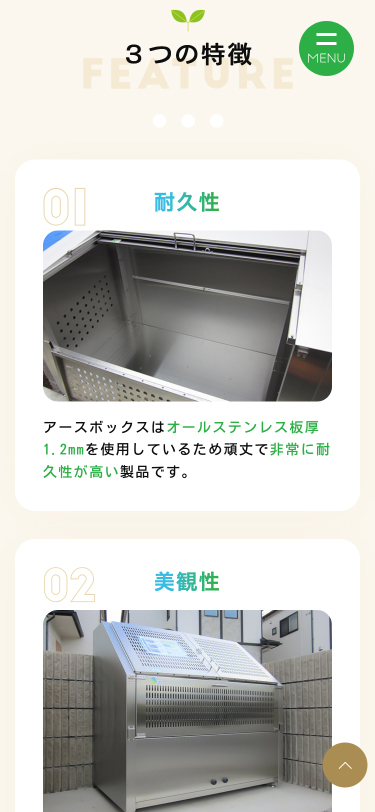 ゴミボックスを扱うサイトということで、何よりも「爽やかさ」と「親しみやすさ」を大切にしたデザインを心がけました。角ばった製品の印象をやわらげるため、全体には丸みを帯びたトーンを採用し、環境配慮をイメージさせるグリーンとブルーのロゴカラーで印象づけを行っています。