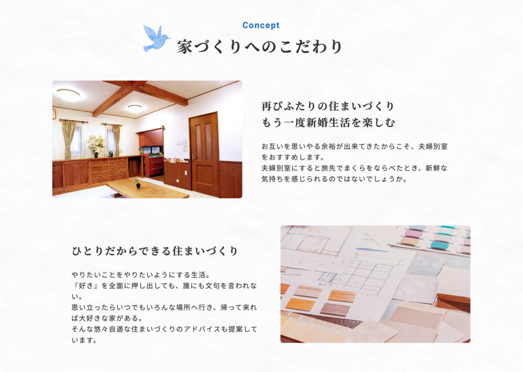 「今後は、代表のお人柄を知ってくださる方からの、お問い合わせが欲しい」とのご要望を叶えるべく、クライアントさまの家づくりのこだわり、代表紹介を読んだのちにお問い合わせに繋がるような動線になるよう意識しました。