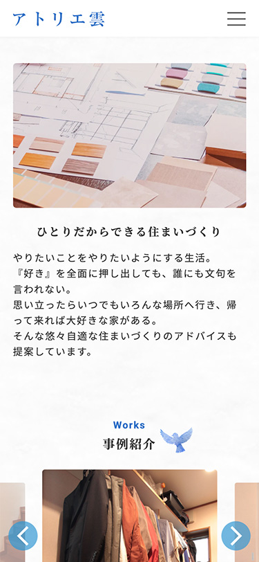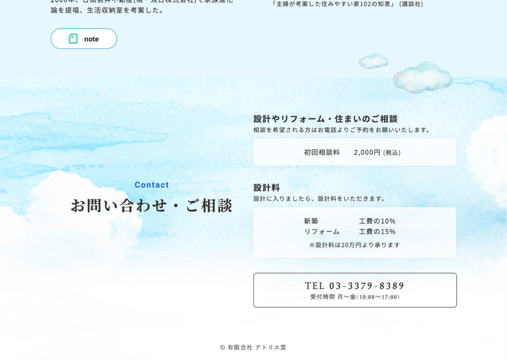 コーダーとしてアトリエ雲さんの事務所を訪問させていただきました。実際にクライアントさんにお会いできる機会はほとんどないので、とても貴重な経験でした。竹岡さまが喜ぶお顔を想像して、より良いものを作ろうと制作に取り組んだのを覚えています。 サイトは簡潔であるからこその表示スピードやデバイス間でのブレを起こさないことを意識しました。誰もが親し見やすく温かみを感じるサイトになり嬉しく思います。